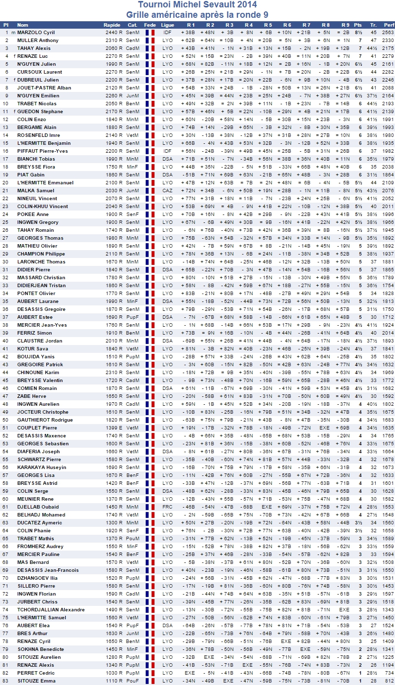 Précisions tout de même que c'est le Maître international Cyril Marzolo (2440 Elo) qui l'a emporté sur le score de 8.5/9. Anthony Muller (2310 Elo) et Alexis Tahay (2060 Elo) complètent quant à eux le podium avec chacun 7/9.
