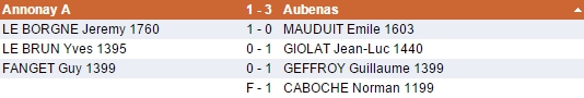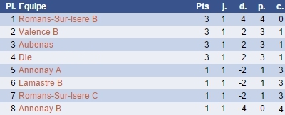Dans les autres rencontres, Romans-sur-Isère B a écrasé l'équipe B d'Annonay (4-0) et devient le premier leader du groupe, alors que Valence B l'a emporté contre Romans-sur-Isère C (3-1), tout comme Die face à Lamastre B (3-1).