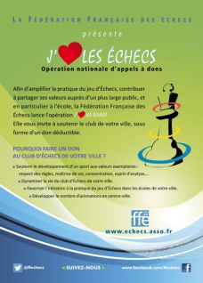 La Fédération française des échecs (FFE) lance une opération nationale d'appel aux dons en faveur des clubs d'Échecs - J'♥ les échecs - qui débutera le 3 novembre 2014 dans toute la France et qui sera active jusqu'en décembre 2014.