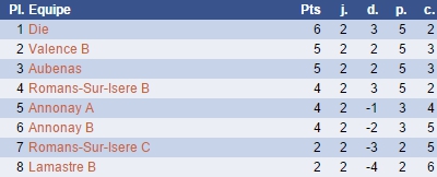 Profitant des contre-performances des autres équipes (Romans-sur-Isère C perd 1-2 face à Annonay A, et Die l'emporte contre Romans-sur-Isère B sur le même score), le club conserve encore sa seconde place au classement qu'il partage avec son adversaire du jour :