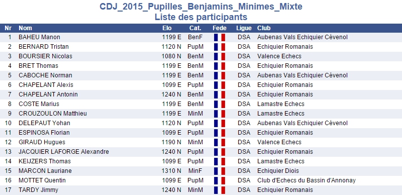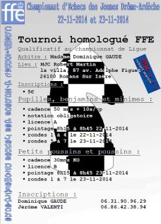 Ce tournoi qualificatif pour le Championnat régional de la Ligue Dauphiné-Savoie des échecs verra s’illustrer 5 licenciés de l'Aubenas-Vals Échiquier Cévenol ! En effet seront présents : Manon Baheu (BenF, 1199 Elo), Norman Caboche (BenM, 1199 Elo), Yohan Delepaut (PupM, 1130 Elo), Damien Delepaut (PouM, 1090 Elo), et Juliette Molle (PouF, 1009 Elo).
