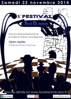 Le 5ème festival du club d'échecs de la Tour Blanche se tenait ce samedi 22 novembre dans la magnifique salle des fêtes de la mairie du XXème arrondissement de Paris. Il s'agissait d'un Open rapide de 9 rondes jouées à la cadence Fischer de 12 min. + 3 sec./coup.