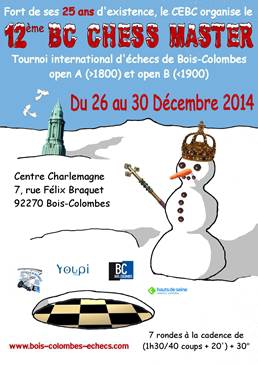 Comme chaque année maintenant depuis 12 ans, le Cercle d’Échecs de Bois-Colombes organise son grand open de fin d’année du 26 au 30 décembre 2014.