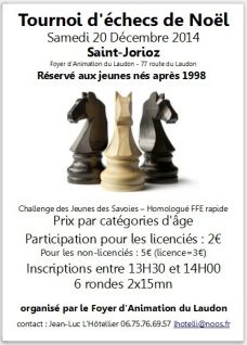 Le Foyer d'animation du Laudon organise le samedi 20 décembre 2014 son tournoi d'échecs de Noël.