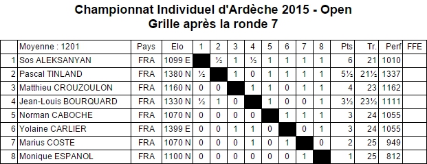 Au terme des sept rondes c'est le jeune Sos qui a empoché la couronne de Champion d'Ardèche avec 6 points sur 7 ! Jean-Louis et Norman n'ont pas non plus démérité puisqu'ils finissent aux 4ème et 5ème places avec respectivement 3.5 et 3 points sur 7. Félicitations à vous trois !
