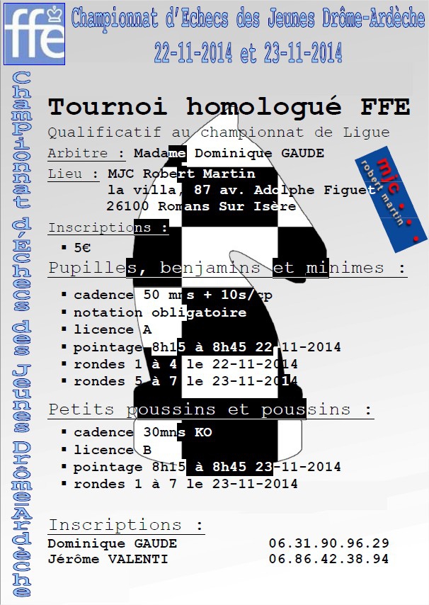 Les comités départementaux d'échecs de Drôme et d'Ardèche organisaient en collaboration à Romans-sur-Isère, les samedi 22 et dimanche 23 novembre 2014, le Championnat d'échecs des Jeunes Drôme-Ardèche. Ce tournoi, qualificatif pour le Championnat régional de la Ligue Dauphiné-Savoie des échecs, voyait la participation de cinq jeunes licenciés de l'Aubenas-Vals Échiquier Cévenol qui s'y sont brillamment illustrés !