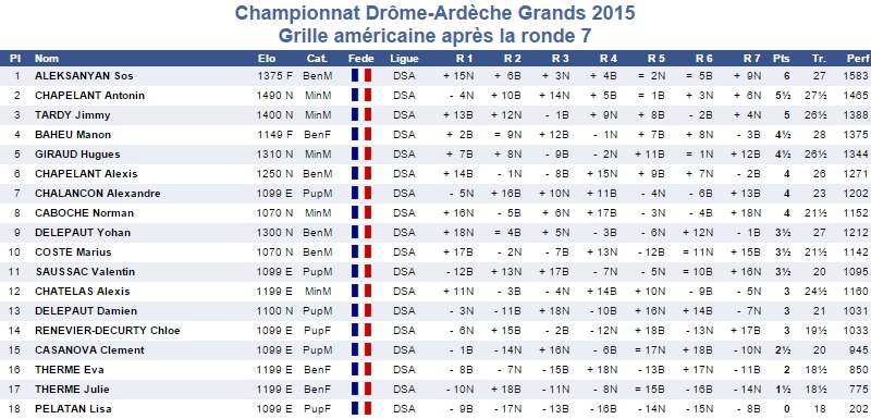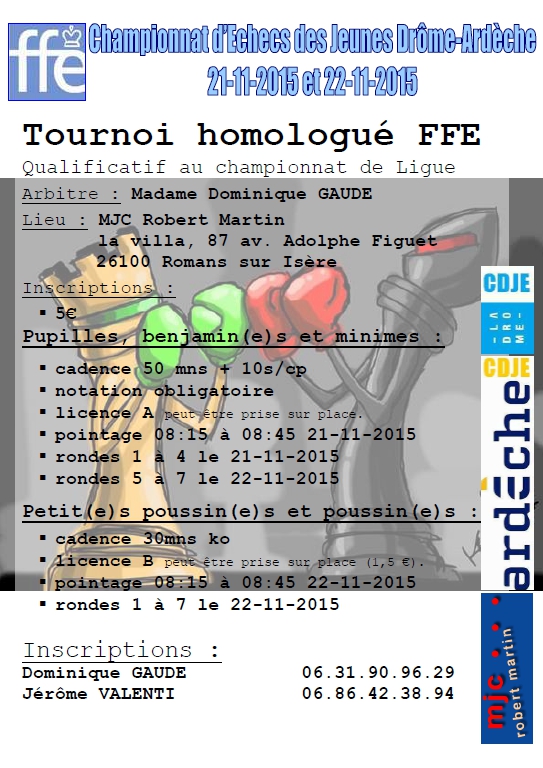 Les comités départementaux d'échecs de Drôme et d'Ardèche organisaient une nouvelle fois en collaboration à Romans-sur-Isère, les samedi 21 et dimanche 22 novembre 2015, le Championnat d'échecs des Jeunes Drôme-Ardèche.