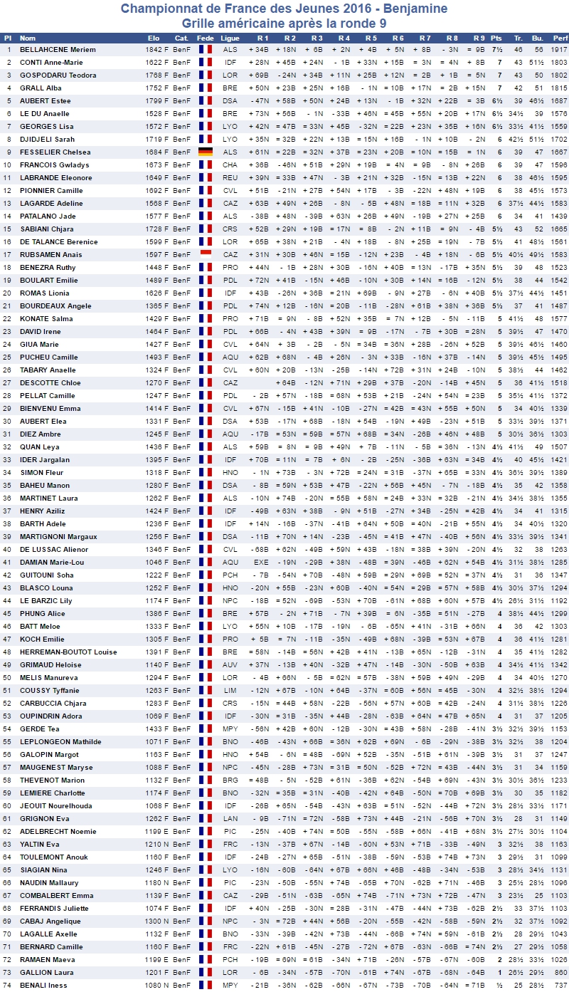 S'agissant du haut du classement, l'alsacienne Meriem Bellahcene (1842 Elo), est courronée Championne de France avec 7.5/9. Elle devance Anne-Marie Conti (1622 Elo) et Téodora Gospodaru (1768 Elo) qui comptabilisaient toutes deux 7 points sur 9.