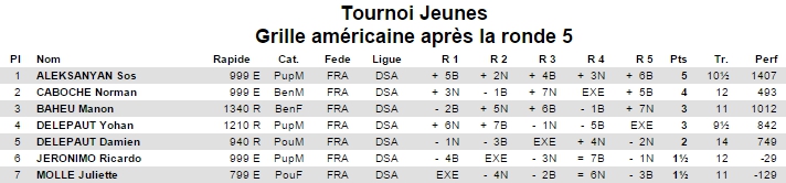 Sos Aleksanyan l'a brillamment emporté au terme des 5 rondes avec un sans-faute (5/5). Il est suivi par les deux benjamins du club, Norman Caboche (4/5) et Manon Baheu (3/5). Félicitations à tous !!!