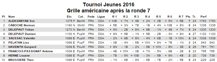 C'est donc une nouvelle fois Sos qui s'est imposé avec un sans faute au terme des 7 rondes. Il est suivi de près par Norman et Yohan avec respectivement 6 et 5 points. Un deuxième tournoi Jeunes se tiendra en avril ou en mai prochain. En attendant, félicitations à toutes et tous.