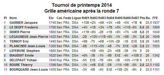 Deuxième édition du tournoi de printemps ! Onze participants cette année qui se sont affrontés sur sept rondes à la cadence de 2 x 15 minutes + 3 secondes par coup. Une belle journée et un beau vainqueur en la personne de Jacques Garnier qui s'impose avec un total de 6 points.